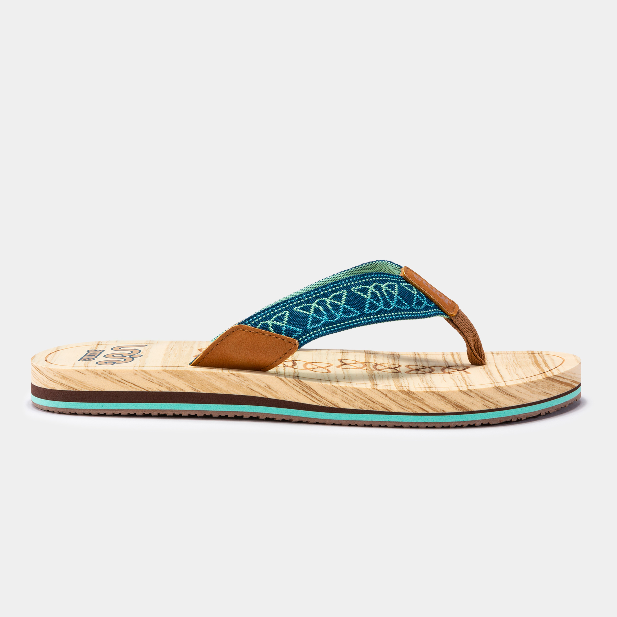 La suela es de espuma ligera, con efecto óptico simulando la madera. Muy cómoda y flexible por su bajo peso.
